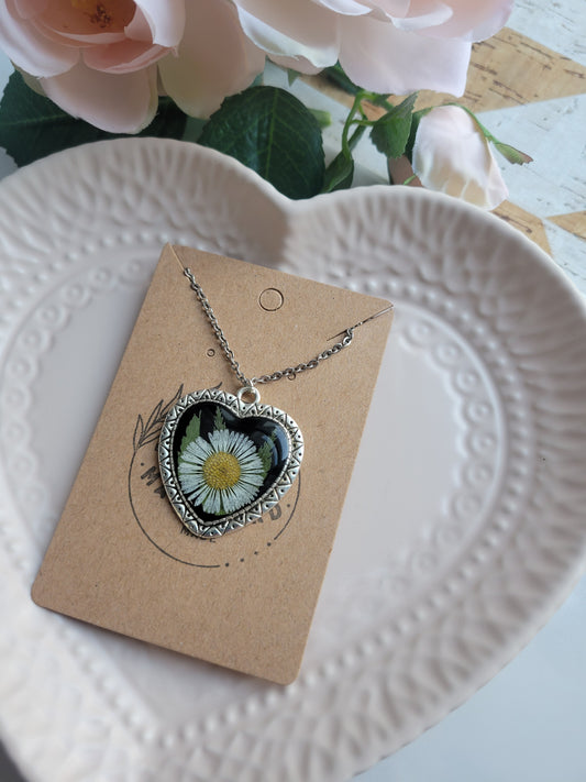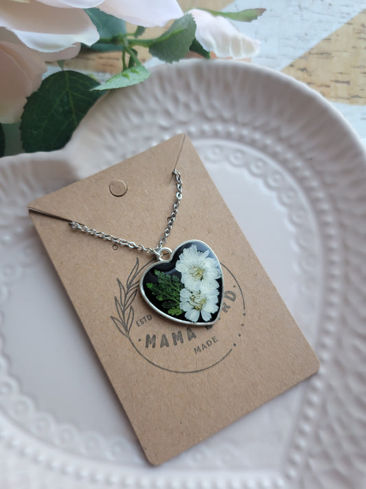 Silver Heart Pendant w/Pressed Flowers Necklace