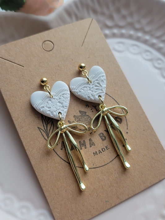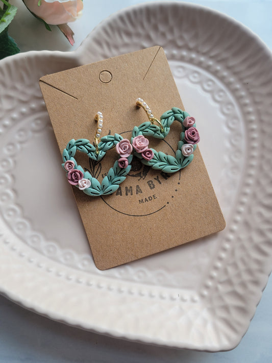 Floral Heart Wreath Dangles on Gold Pearl Stud